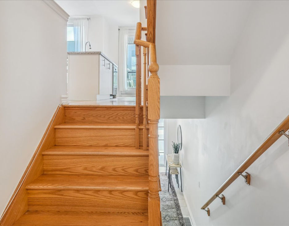for entertaining.An elegant oak staircase leads to the upper level, where the spacious primary bedroom boasts large windows and a 4-piece ensuite. The generously sized second bedroom (nearly 9 x 13 ft) offers a light, airy feel with access to its own private balcony, along with an additional 4-piece bathroom on this level.The third floor reveals a stunning, oversized rooftop terrace-ideal for hosting friends and family or